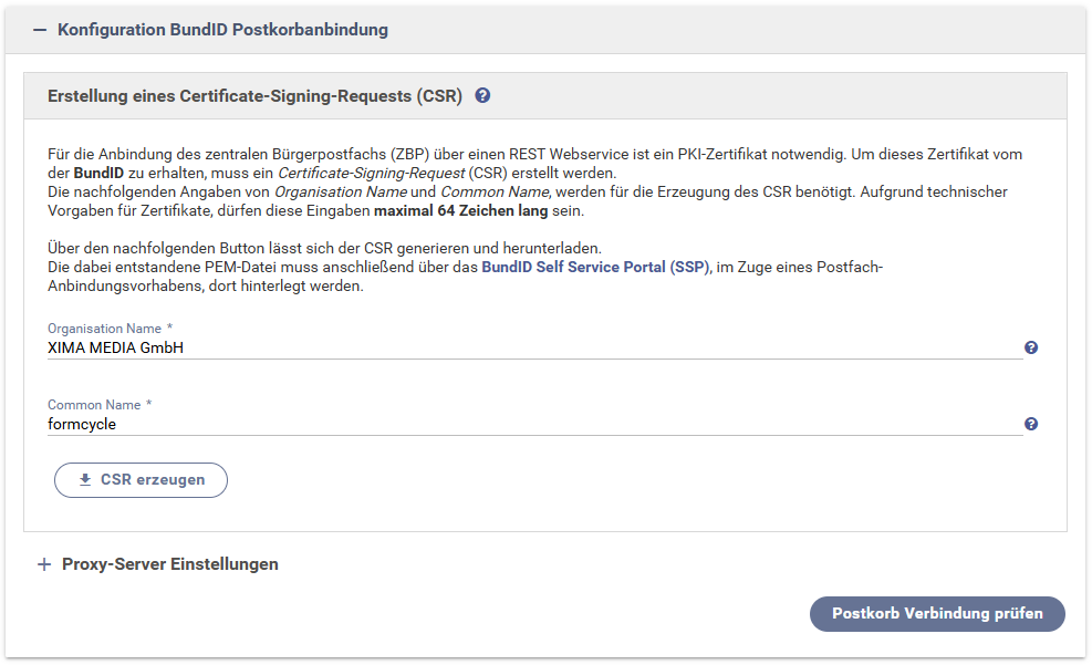 Weiterhin können die Daten für einen Proxy-Server hinterlegt werden, wenn dieser für die Kommunikation zum BundID Postkorb notwendig sein sollte.