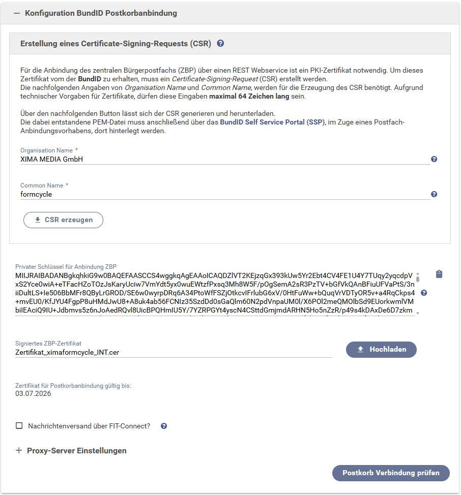 - die für die Postkorb-Anbindung notwendige Konfiguration muss vollständig hinterlegt sein. (Privater Schlüssel und PKI-Zertifikat aus dem BundID SSP müssen in den Einstellungen hinterlegt sein)