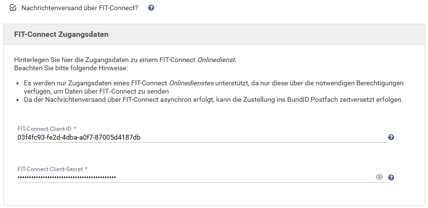 Hinweis: Die hinterlegten Zugangsdaten (Client-ID, Client-Secret) müssen zu einem FIT-Connect Onlinedienst gehören. Zugangsdaten eines Verwaltungssystems werden nicht unterstützt, da diese nicht die notwendigen Berechtigungen aufweisen.