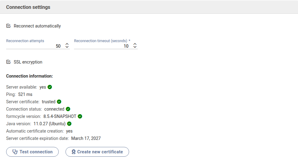 When this option is activated, the master server will attempt to establish a connection to the frontend server automatically when the master server is first started as well as when changing and saving the connection settings.