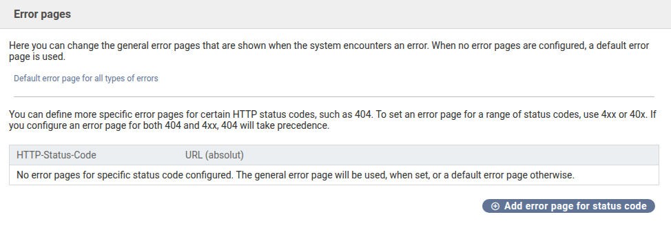 The error page configuration is used to replace the default error page (or generic server error messages) with custom error pages. If no specific error pages are configured, the system falls back to a default error page. Absolute URLs are always required.
