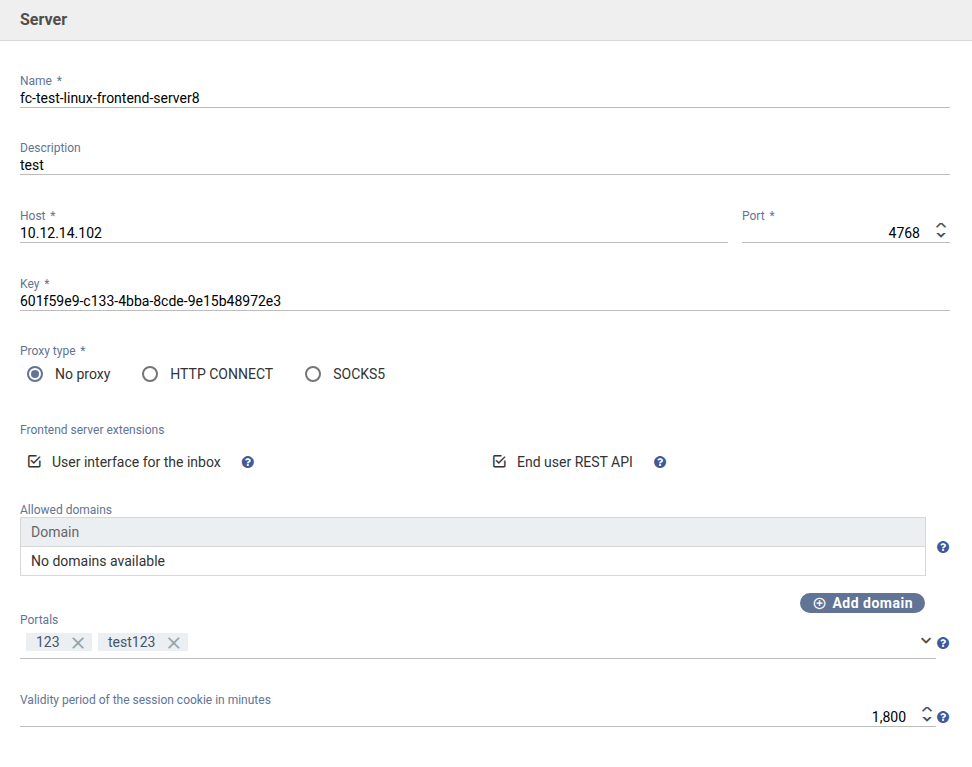 For the frontend server, the validity period of the session cookie can also be configured. The value is specified in minutes and defines how long a session remains active before an automatic logout occurs.