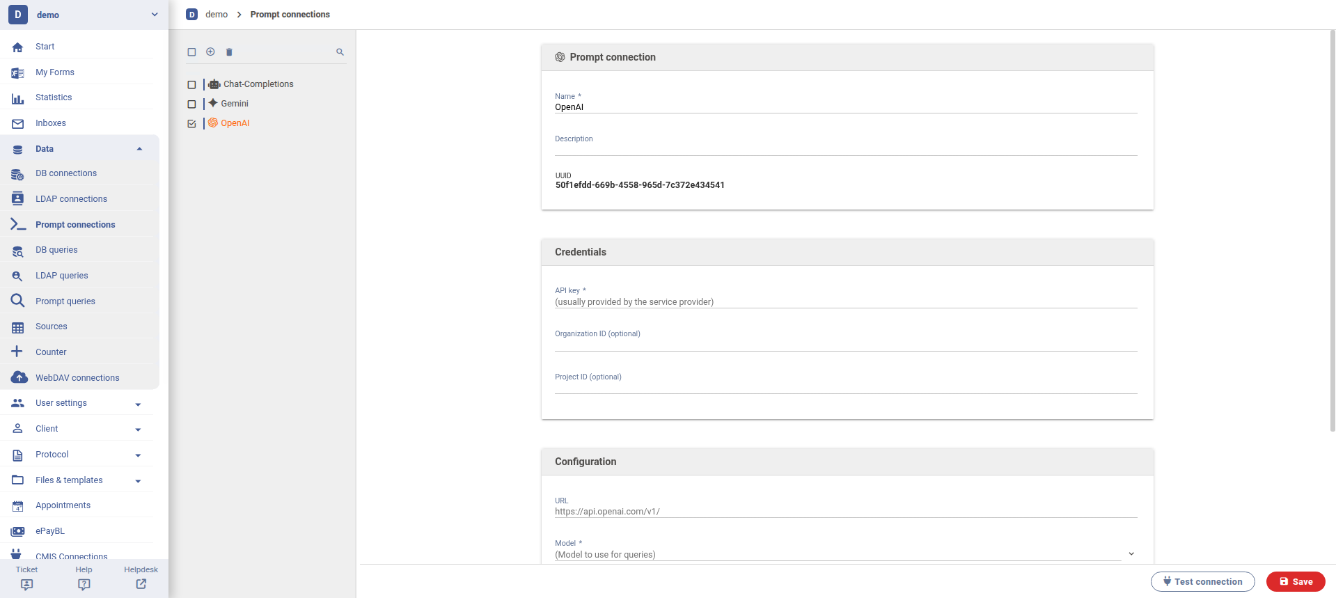 For general information, see the help article prompt connections. The following section describes the configuration specific to OpenAI.