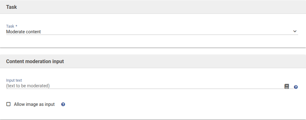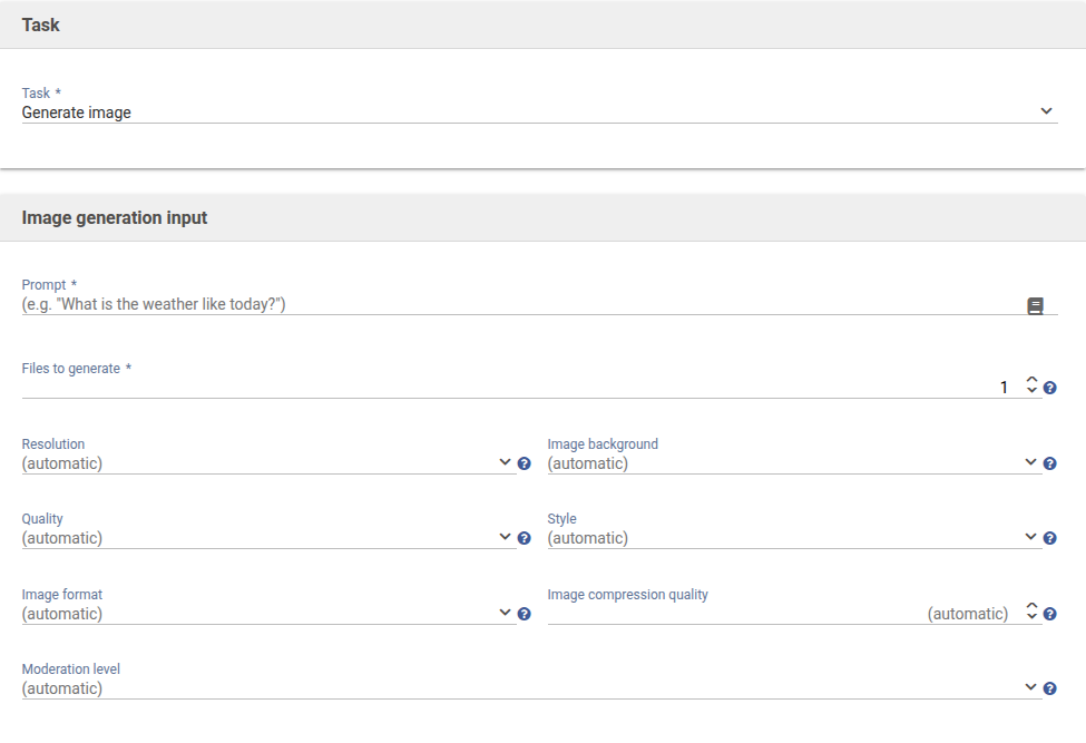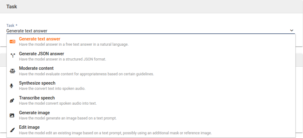 When using the OpenAI plugin, additional tasks are available. The selected task determines which inputs are supported and in which format the result is returned. Depending on the task, the configuration sections differ.