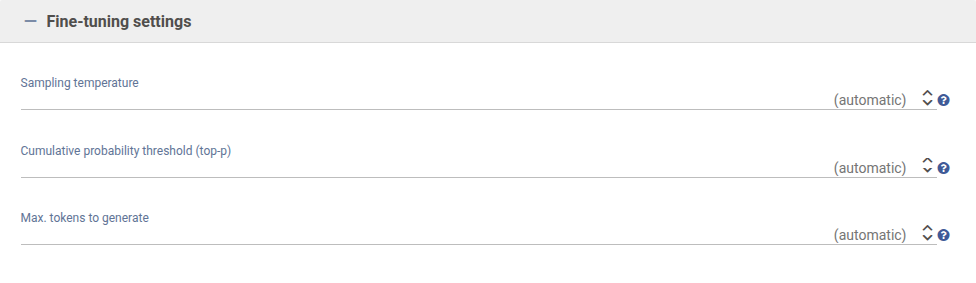 The Fine-Tuning section allows optional parameters that influence response behavior to be adjusted. These settings are not required for every use case. In general, the default value "automatic" can be retained.