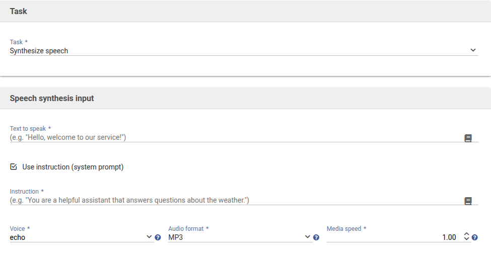 The "Input for speech synthesis" section defines which text should be spoken. Optionally, an additional instruction can be provided to influence style or emphasis.