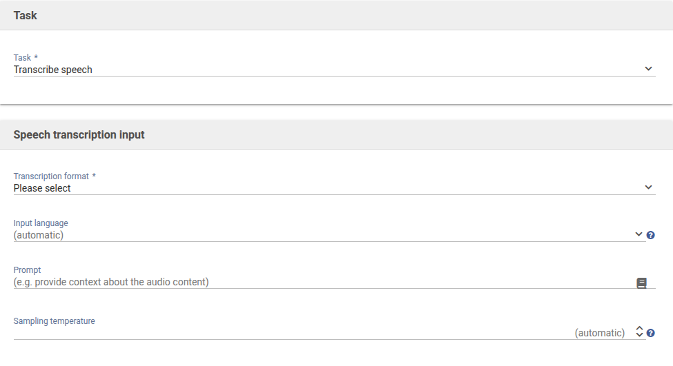 This task automatically converts spoken language from an audio file into written text. The AI analyzes the audio content and creates a transcript, which is returned in different structures depending on the selected format.