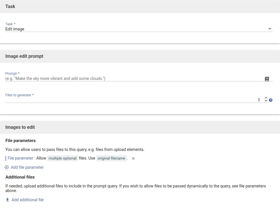This task is used to modify an existing image in a targeted way. It is based on an uploaded image that is adjusted or extended using a text instruction. This makes it possible to correct specific areas, add or remove objects, or change the style.